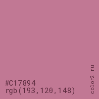 Цвет #C17894 в цветовой модели RGB обозначается тремя октетами (193, 120, 148) в десятичном формате и #C17894 в шестнадцатиричном (hex) формате, которые являются интенсивностью красного 193 (hex C1), интенсивность зелёного 120 (hex 78) и интенсивность синего 148 (hex 94).