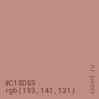 Цвет #C18D83 в цветовой модели RGB обозначается тремя октетами (193, 141, 131) в десятичном формате и #C18D83 в шестнадцатиричном (hex) формате, которые являются интенсивностью красного 193 (hex C1), интенсивность зелёного 141 (hex 8D) и интенсивность синего 131 (hex 83).