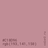 Цвет #C18D96 в цветовой модели RGB обозначается тремя октетами (193, 141, 150) в десятичном формате и #C18D96 в шестнадцатиричном (hex) формате, которые являются интенсивностью красного 193 (hex C1), интенсивность зелёного 141 (hex 8D) и интенсивность синего 150 (hex 96).