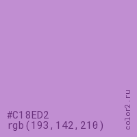 Цвет #C18ED2 в цветовой модели RGB обозначается тремя октетами (193, 142, 210) в десятичном формате и #C18ED2 в шестнадцатиричном (hex) формате, которые являются интенсивностью красного 193 (hex C1), интенсивность зелёного 142 (hex 8E) и интенсивность синего 210 (hex D2).