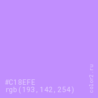Цвет #C18EFE в цветовой модели RGB обозначается тремя октетами (193, 142, 254) в десятичном формате и #C18EFE в шестнадцатиричном (hex) формате, которые являются интенсивностью красного 193 (hex C1), интенсивность зелёного 142 (hex 8E) и интенсивность синего 254 (hex FE).
