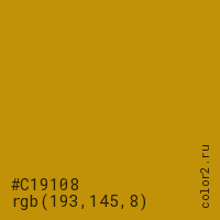 Цвет #C19108 в цветовой модели RGB обозначается тремя октетами (193, 145, 8) в десятичном формате и #C19108 в шестнадцатиричном (hex) формате, которые являются интенсивностью красного 193 (hex C1), интенсивность зелёного 145 (hex 91) и интенсивность синего 8 (hex 08).