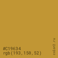 Цвет #C19634 в цветовой модели RGB обозначается тремя октетами (193, 150, 52) в десятичном формате и #C19634 в шестнадцатиричном (hex) формате, которые являются интенсивностью красного 193 (hex C1), интенсивность зелёного 150 (hex 96) и интенсивность синего 52 (hex 34).