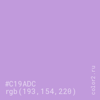 Цвет #C19ADC в цветовой модели RGB обозначается тремя октетами (193, 154, 220) в десятичном формате и #C19ADC в шестнадцатиричном (hex) формате, которые являются интенсивностью красного 193 (hex C1), интенсивность зелёного 154 (hex 9A) и интенсивность синего 220 (hex DC).