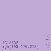 Цвет #C1AAD5 в цветовой модели RGB обозначается тремя октетами (193, 170, 213) в десятичном формате и #C1AAD5 в шестнадцатиричном (hex) формате, которые являются интенсивностью красного 193 (hex C1), интенсивность зелёного 170 (hex AA) и интенсивность синего 213 (hex D5).