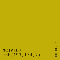 Цвет #C1AE07 в цветовой модели RGB обозначается тремя октетами (193, 174, 7) в десятичном формате и #C1AE07 в шестнадцатиричном (hex) формате, которые являются интенсивностью красного 193 (hex C1), интенсивность зелёного 174 (hex AE) и интенсивность синего 7 (hex 07).