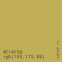 Цвет #C1AF58 в цветовой модели RGB обозначается тремя октетами (193, 175, 88) в десятичном формате и #C1AF58 в шестнадцатиричном (hex) формате, которые являются интенсивностью красного 193 (hex C1), интенсивность зелёного 175 (hex AF) и интенсивность синего 88 (hex 58).