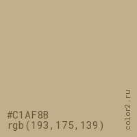 Цвет #C1AF8B в цветовой модели RGB обозначается тремя октетами (193, 175, 139) в десятичном формате и #C1AF8B в шестнадцатиричном (hex) формате, которые являются интенсивностью красного 193 (hex C1), интенсивность зелёного 175 (hex AF) и интенсивность синего 139 (hex 8B).