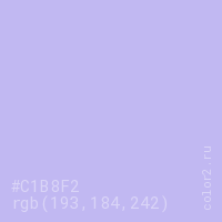 Цвет #C1B8F2 в цветовой модели RGB обозначается тремя октетами (193, 184, 242) в десятичном формате и #C1B8F2 в шестнадцатиричном (hex) формате, которые являются интенсивностью красного 193 (hex C1), интенсивность зелёного 184 (hex B8) и интенсивность синего 242 (hex F2).