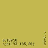 Цвет #C1B950 в цветовой модели RGB обозначается тремя октетами (193, 185, 80) в десятичном формате и #C1B950 в шестнадцатиричном (hex) формате, которые являются интенсивностью красного 193 (hex C1), интенсивность зелёного 185 (hex B9) и интенсивность синего 80 (hex 50).