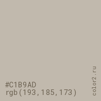 Цвет #C1B9AD в цветовой модели RGB обозначается тремя октетами (193, 185, 173) в десятичном формате и #C1B9AD в шестнадцатиричном (hex) формате, которые являются интенсивностью красного 193 (hex C1), интенсивность зелёного 185 (hex B9) и интенсивность синего 173 (hex AD).
