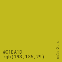 Цвет #C1BA1D в цветовой модели RGB обозначается тремя октетами (193, 186, 29) в десятичном формате и #C1BA1D в шестнадцатиричном (hex) формате, которые являются интенсивностью красного 193 (hex C1), интенсивность зелёного 186 (hex BA) и интенсивность синего 29 (hex 1D).