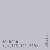 Цвет #C1BFC8 в цветовой модели RGB обозначается тремя октетами (193, 191, 200) в десятичном формате и #C1BFC8 в шестнадцатиричном (hex) формате, которые являются интенсивностью красного 193 (hex C1), интенсивность зелёного 191 (hex BF) и интенсивность синего 200 (hex C8).