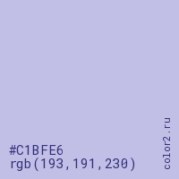 Цвет #C1BFE6 в цветовой модели RGB обозначается тремя октетами (193, 191, 230) в десятичном формате и #C1BFE6 в шестнадцатиричном (hex) формате, которые являются интенсивностью красного 193 (hex C1), интенсивность зелёного 191 (hex BF) и интенсивность синего 230 (hex E6).