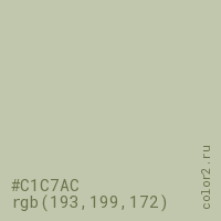 Цвет #C1C7AC в цветовой модели RGB обозначается тремя октетами (193, 199, 172) в десятичном формате и #C1C7AC в шестнадцатиричном (hex) формате, которые являются интенсивностью красного 193 (hex C1), интенсивность зелёного 199 (hex C7) и интенсивность синего 172 (hex AC).