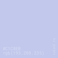 Цвет #C1C8EB в цветовой модели RGB обозначается тремя октетами (193, 200, 235) в десятичном формате и #C1C8EB в шестнадцатиричном (hex) формате, которые являются интенсивностью красного 193 (hex C1), интенсивность зелёного 200 (hex C8) и интенсивность синего 235 (hex EB).