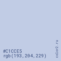 Цвет #C1CCE5 в цветовой модели RGB обозначается тремя октетами (193, 204, 229) в десятичном формате и #C1CCE5 в шестнадцатиричном (hex) формате, которые являются интенсивностью красного 193 (hex C1), интенсивность зелёного 204 (hex CC) и интенсивность синего 229 (hex E5).