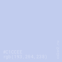 Цвет #C1CCEE в цветовой модели RGB обозначается тремя октетами (193, 204, 238) в десятичном формате и #C1CCEE в шестнадцатиричном (hex) формате, которые являются интенсивностью красного 193 (hex C1), интенсивность зелёного 204 (hex CC) и интенсивность синего 238 (hex EE).