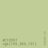 Цвет #C1CD97 в цветовой модели RGB обозначается тремя октетами (193, 205, 151) в десятичном формате и #C1CD97 в шестнадцатиричном (hex) формате, которые являются интенсивностью красного 193 (hex C1), интенсивность зелёного 205 (hex CD) и интенсивность синего 151 (hex 97).