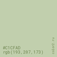 Цвет #C1CFAD в цветовой модели RGB обозначается тремя октетами (193, 207, 173) в десятичном формате и #C1CFAD в шестнадцатиричном (hex) формате, которые являются интенсивностью красного 193 (hex C1), интенсивность зелёного 207 (hex CF) и интенсивность синего 173 (hex AD).