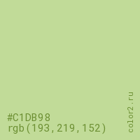 Цвет #C1DB98 в цветовой модели RGB обозначается тремя октетами (193, 219, 152) в десятичном формате и #C1DB98 в шестнадцатиричном (hex) формате, которые являются интенсивностью красного 193 (hex C1), интенсивность зелёного 219 (hex DB) и интенсивность синего 152 (hex 98).