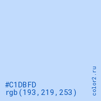 Цвет #C1DBFD в цветовой модели RGB обозначается тремя октетами (193, 219, 253) в десятичном формате и #C1DBFD в шестнадцатиричном (hex) формате, которые являются интенсивностью красного 193 (hex C1), интенсивность зелёного 219 (hex DB) и интенсивность синего 253 (hex FD).