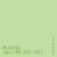 Цвет #C1DFA2 в цветовой модели RGB обозначается тремя октетами (193, 223, 162) в десятичном формате и #C1DFA2 в шестнадцатиричном (hex) формате, которые являются интенсивностью красного 193 (hex C1), интенсивность зелёного 223 (hex DF) и интенсивность синего 162 (hex A2).
