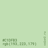 Цвет #C1DFB3 в цветовой модели RGB обозначается тремя октетами (193, 223, 179) в десятичном формате и #C1DFB3 в шестнадцатиричном (hex) формате, которые являются интенсивностью красного 193 (hex C1), интенсивность зелёного 223 (hex DF) и интенсивность синего 179 (hex B3).