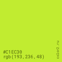 Цвет #C1EC30 в цветовой модели RGB обозначается тремя октетами (193, 236, 48) в десятичном формате и #C1EC30 в шестнадцатиричном (hex) формате, которые являются интенсивностью красного 193 (hex C1), интенсивность зелёного 236 (hex EC) и интенсивность синего 48 (hex 30).