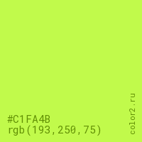 Цвет #C1FA4B в цветовой модели RGB обозначается тремя октетами (193, 250, 75) в десятичном формате и #C1FA4B в шестнадцатиричном (hex) формате, которые являются интенсивностью красного 193 (hex C1), интенсивность зелёного 250 (hex FA) и интенсивность синего 75 (hex 4B).