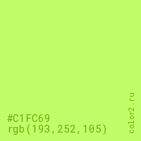 Цвет #C1FC69 в цветовой модели RGB обозначается тремя октетами (193, 252, 105) в десятичном формате и #C1FC69 в шестнадцатиричном (hex) формате, которые являются интенсивностью красного 193 (hex C1), интенсивность зелёного 252 (hex FC) и интенсивность синего 105 (hex 69).