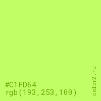 Цвет #C1FD64 в цветовой модели RGB обозначается тремя октетами (193, 253, 100) в десятичном формате и #C1FD64 в шестнадцатиричном (hex) формате, которые являются интенсивностью красного 193 (hex C1), интенсивность зелёного 253 (hex FD) и интенсивность синего 100 (hex 64).