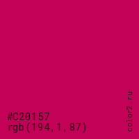 Цвет #C20157 в цветовой модели RGB обозначается тремя октетами (194, 1, 87) в десятичном формате и #C20157 в шестнадцатиричном (hex) формате, которые являются интенсивностью красного 194 (hex C2), интенсивность зелёного 1 (hex 01) и интенсивность синего 87 (hex 57).
