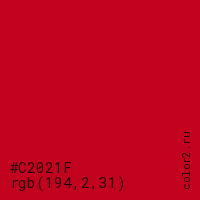 Цвет #C2021F в цветовой модели RGB обозначается тремя октетами (194, 2, 31) в десятичном формате и #C2021F в шестнадцатиричном (hex) формате, которые являются интенсивностью красного 194 (hex C2), интенсивность зелёного 2 (hex 02) и интенсивность синего 31 (hex 1F).