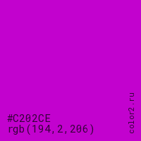 Цвет #C202CE в цветовой модели RGB обозначается тремя октетами (194, 2, 206) в десятичном формате и #C202CE в шестнадцатиричном (hex) формате, которые являются интенсивностью красного 194 (hex C2), интенсивность зелёного 2 (hex 02) и интенсивность синего 206 (hex CE).
