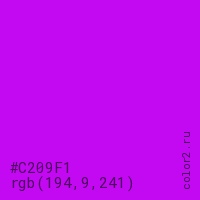 Цвет #C209F1 в цветовой модели RGB обозначается тремя октетами (194, 9, 241) в десятичном формате и #C209F1 в шестнадцатиричном (hex) формате, которые являются интенсивностью красного 194 (hex C2), интенсивность зелёного 9 (hex 09) и интенсивность синего 241 (hex F1).