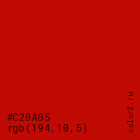 Цвет #C20A05 в цветовой модели RGB обозначается тремя октетами (194, 10, 5) в десятичном формате и #C20A05 в шестнадцатиричном (hex) формате, которые являются интенсивностью красного 194 (hex C2), интенсивность зелёного 10 (hex 0A) и интенсивность синего 5 (hex 05).