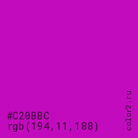 Цвет #C20BBC в цветовой модели RGB обозначается тремя октетами (194, 11, 188) в десятичном формате и #C20BBC в шестнадцатиричном (hex) формате, которые являются интенсивностью красного 194 (hex C2), интенсивность зелёного 11 (hex 0B) и интенсивность синего 188 (hex BC).