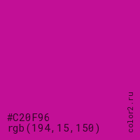 Цвет #C20F96 в цветовой модели RGB обозначается тремя октетами (194, 15, 150) в десятичном формате и #C20F96 в шестнадцатиричном (hex) формате, которые являются интенсивностью красного 194 (hex C2), интенсивность зелёного 15 (hex 0F) и интенсивность синего 150 (hex 96).