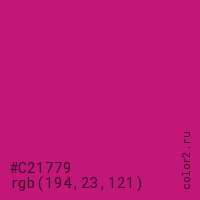 Цвет #C21779 в цветовой модели RGB обозначается тремя октетами (194, 23, 121) в десятичном формате и #C21779 в шестнадцатиричном (hex) формате, которые являются интенсивностью красного 194 (hex C2), интенсивность зелёного 23 (hex 17) и интенсивность синего 121 (hex 79).