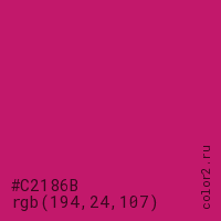 Цвет #C2186B в цветовой модели RGB обозначается тремя октетами (194, 24, 107) в десятичном формате и #C2186B в шестнадцатиричном (hex) формате, которые являются интенсивностью красного 194 (hex C2), интенсивность зелёного 24 (hex 18) и интенсивность синего 107 (hex 6B).
