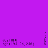 Цвет #C218F0 в цветовой модели RGB обозначается тремя октетами (194, 24, 240) в десятичном формате и #C218F0 в шестнадцатиричном (hex) формате, которые являются интенсивностью красного 194 (hex C2), интенсивность зелёного 24 (hex 18) и интенсивность синего 240 (hex F0).