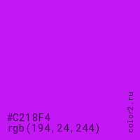 Цвет #C218F4 в цветовой модели RGB обозначается тремя октетами (194, 24, 244) в десятичном формате и #C218F4 в шестнадцатиричном (hex) формате, которые являются интенсивностью красного 194 (hex C2), интенсивность зелёного 24 (hex 18) и интенсивность синего 244 (hex F4).