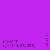 Цвет #C226EE в цветовой модели RGB обозначается тремя октетами (194, 38, 238) в десятичном формате и #C226EE в шестнадцатиричном (hex) формате, которые являются интенсивностью красного 194 (hex C2), интенсивность зелёного 38 (hex 26) и интенсивность синего 238 (hex EE).