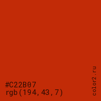 Цвет #C22B07 в цветовой модели RGB обозначается тремя октетами (194, 43, 7) в десятичном формате и #C22B07 в шестнадцатиричном (hex) формате, которые являются интенсивностью красного 194 (hex C2), интенсивность зелёного 43 (hex 2B) и интенсивность синего 7 (hex 07).