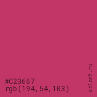 Цвет #C23667 в цветовой модели RGB обозначается тремя октетами (194, 54, 103) в десятичном формате и #C23667 в шестнадцатиричном (hex) формате, которые являются интенсивностью красного 194 (hex C2), интенсивность зелёного 54 (hex 36) и интенсивность синего 103 (hex 67).