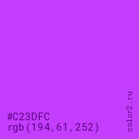 Цвет #C23DFC в цветовой модели RGB обозначается тремя октетами (194, 61, 252) в десятичном формате и #C23DFC в шестнадцатиричном (hex) формате, которые являются интенсивностью красного 194 (hex C2), интенсивность зелёного 61 (hex 3D) и интенсивность синего 252 (hex FC).