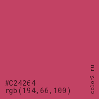Цвет #C24264 в цветовой модели RGB обозначается тремя октетами (194, 66, 100) в десятичном формате и #C24264 в шестнадцатиричном (hex) формате, которые являются интенсивностью красного 194 (hex C2), интенсивность зелёного 66 (hex 42) и интенсивность синего 100 (hex 64).