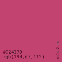 Цвет #C24370 в цветовой модели RGB обозначается тремя октетами (194, 67, 112) в десятичном формате и #C24370 в шестнадцатиричном (hex) формате, которые являются интенсивностью красного 194 (hex C2), интенсивность зелёного 67 (hex 43) и интенсивность синего 112 (hex 70).
