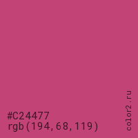 Цвет #C24477 в цветовой модели RGB обозначается тремя октетами (194, 68, 119) в десятичном формате и #C24477 в шестнадцатиричном (hex) формате, которые являются интенсивностью красного 194 (hex C2), интенсивность зелёного 68 (hex 44) и интенсивность синего 119 (hex 77).